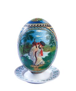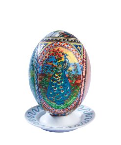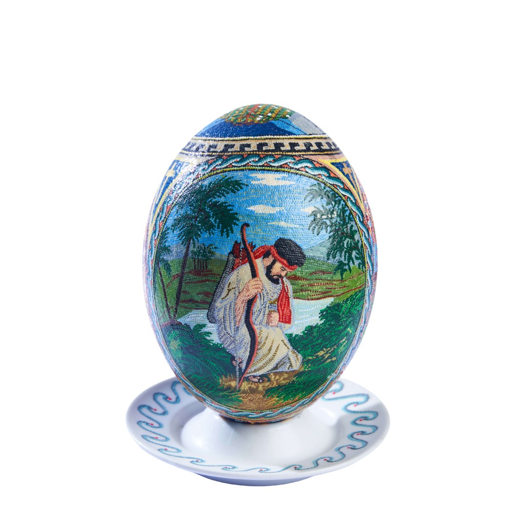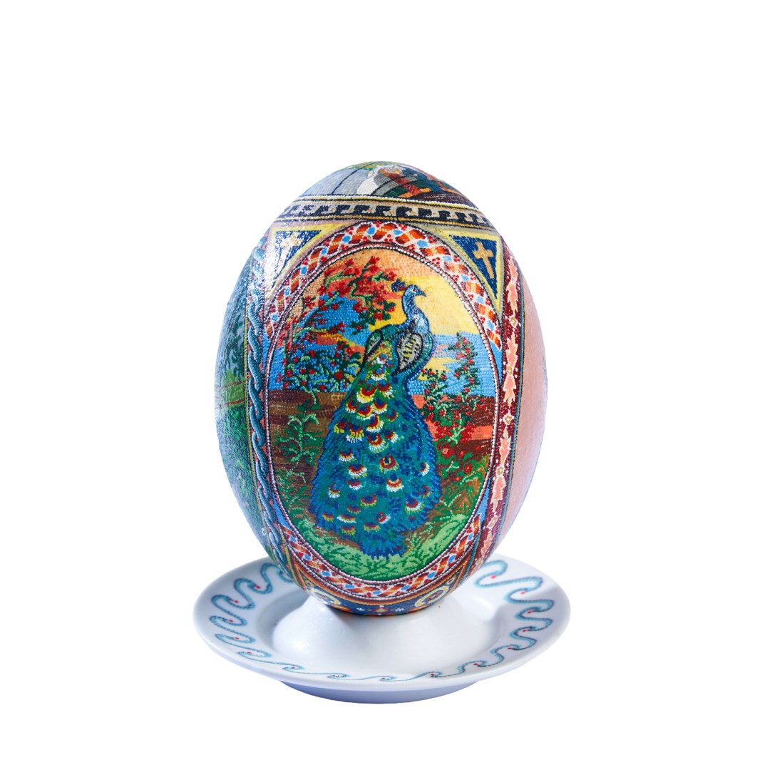his exquisite decorative piece is a genuine ostrich egg, meticulously hand-painted using a high-precision pointillism technique (dot painting). Every single dot is placed with extreme care to create intricate Byzantine-inspired patterns, religious iconography, and nature scenes, making it a rare masterpiece of patience and artistic skill
