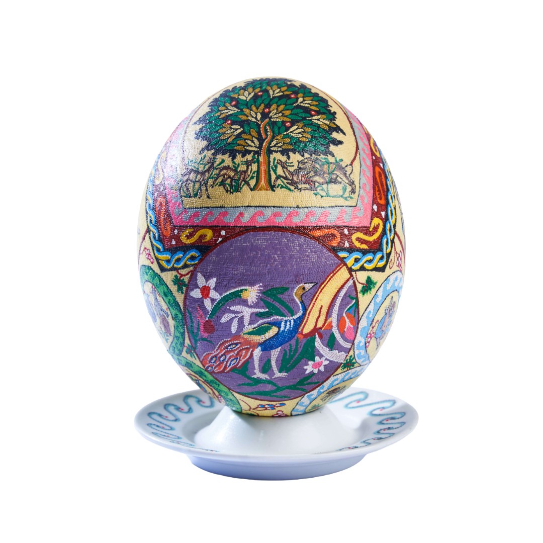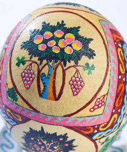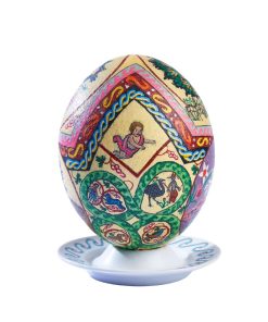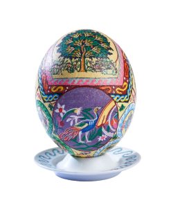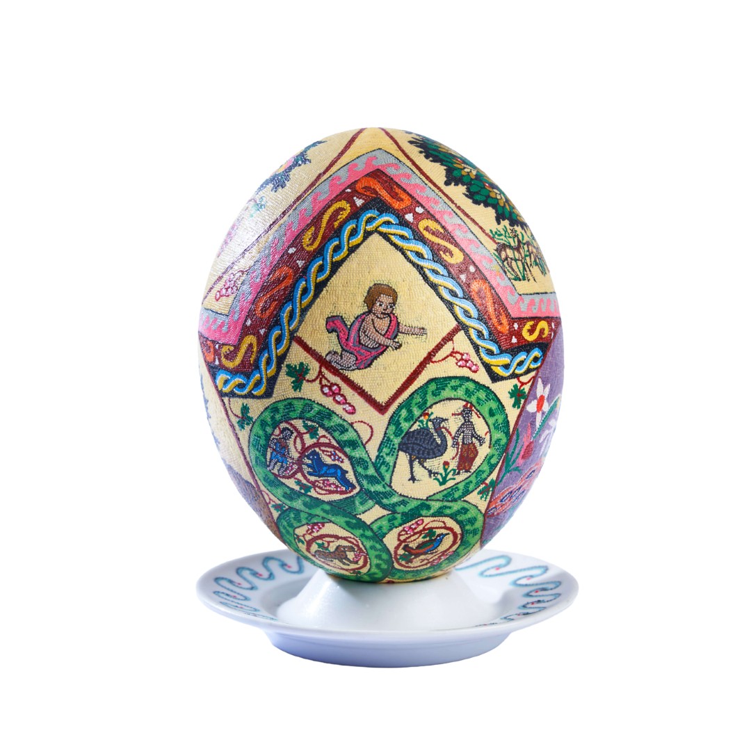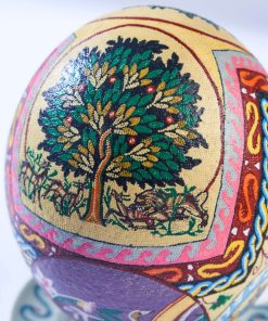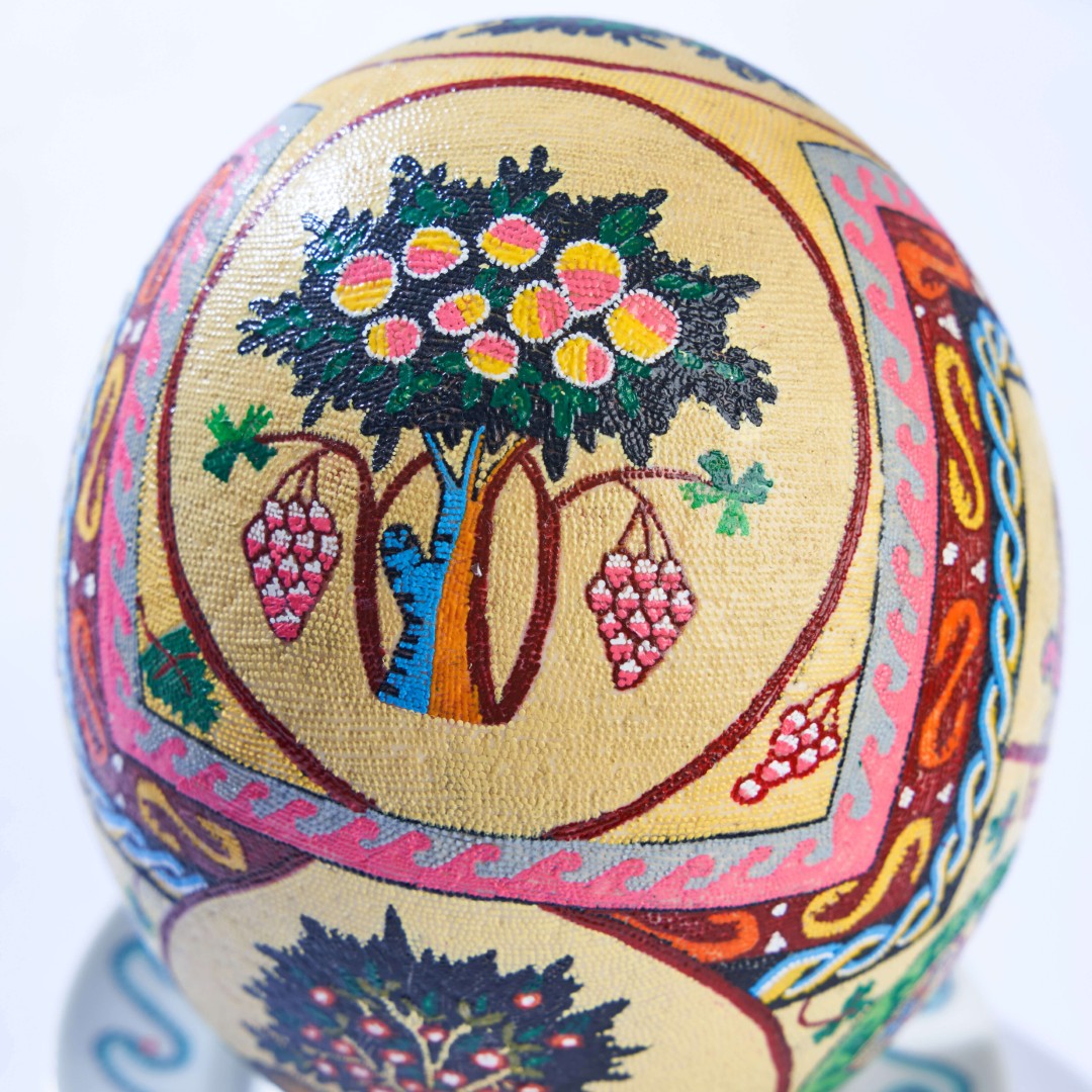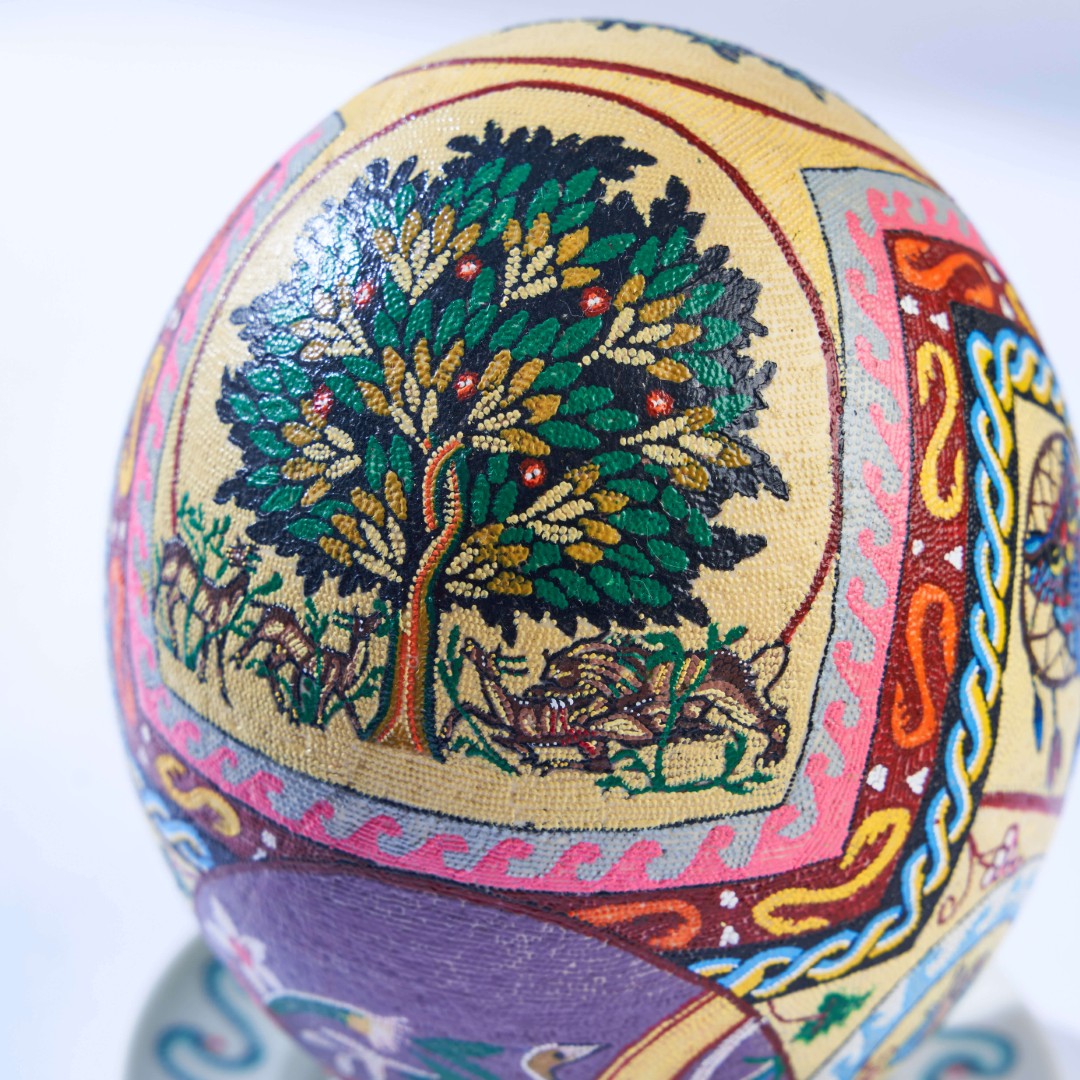 his exquisite decorative piece is a genuine ostrich egg, meticulously hand-painted using a high-precision pointillism technique (dot painting). Every single dot is placed with extreme care to create intricate Byzantine-inspired patterns, religious iconography, and nature scenes, making it a rare masterpiece of patience and artistic skill